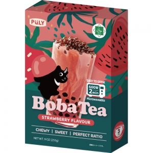 プーリータピオカドリンクは「レンジで3分!おうちタピ活!」をコンセプトに、電子レンジで簡単にお店クオリティのおいしいタピオカドリンクを作れる台湾発のアイテムシリーズ。どこか懐かしい味わいのストロベリーはピンクの色合いで、見た目もの可愛さも人気です。3袋入りでコスパも抜群です。ハラル認証食品<作り方>①中身を取り出し、タピオカを軽くほぐして耐熱容器に入れ、水を100ml注ぐ。②蓋をせずに、電子レンジで加熱する。③ミルクティパウダーを入れてかき混ぜて、氷を入れれば出来上がり!